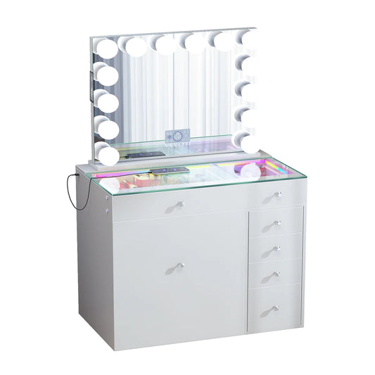 VanitiBar Vivid – RGB LED Vanity Desk with 11 Drawers, Glass Top & USB Charging