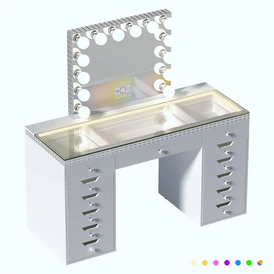 VanitiSet Vivid – RGB LED Vanity Desk with 11 Drawers, Glass Top
