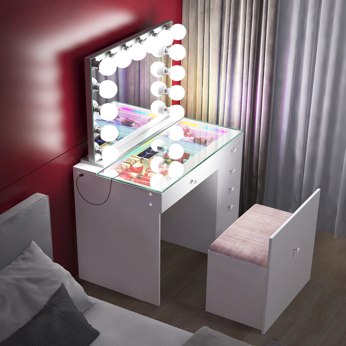 The desk is crafted from durable MDF wood with a tempered glass top, while the mirror features high-quality LED lighting.